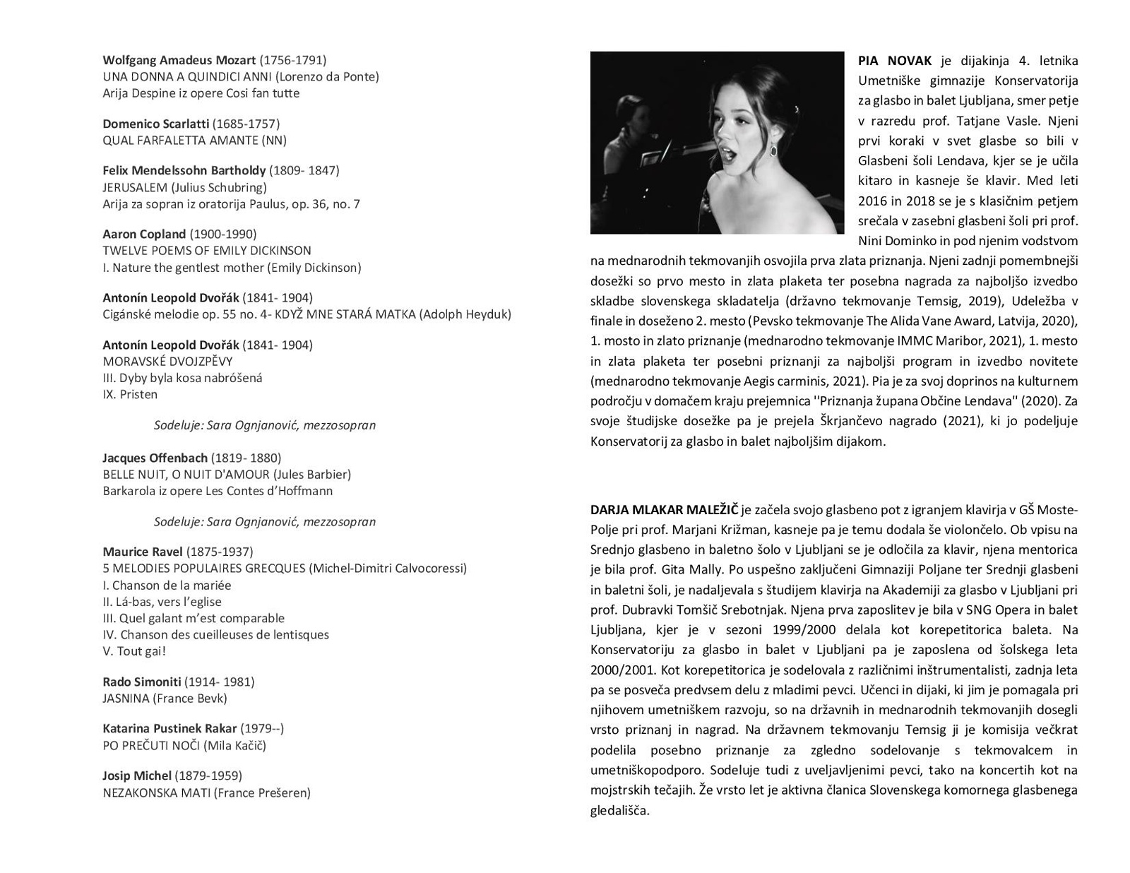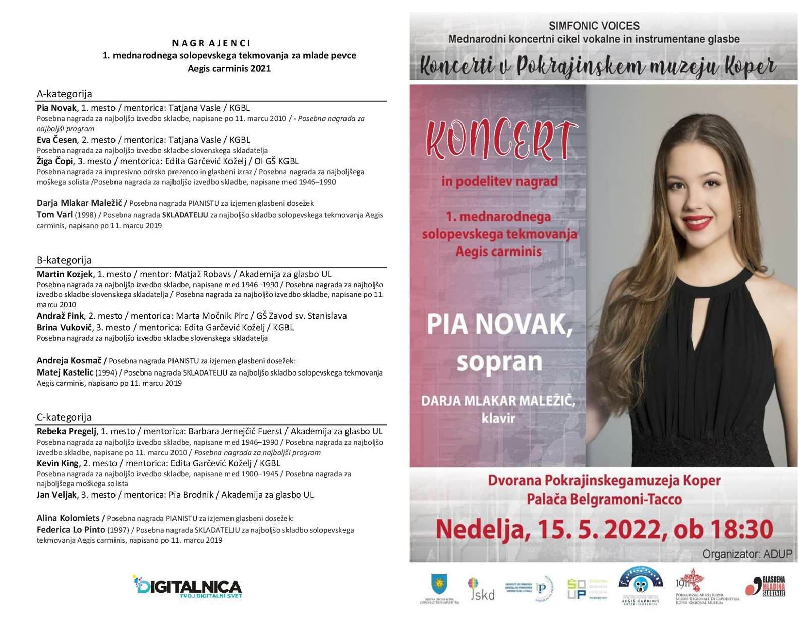 Zadnji, tretji koncert, pa zaključuje ponudbo 2. mednarodnega mladinskega zborovskega festivala Aegis carminis. Prvo nagrajenka, sopranistka Pia Novak se bo predstavila s programom arij in samospevov ob klavirski spremlavi Darje Mlakar Maležič v nedeljo, 15.5.2022, ob 18:30.
