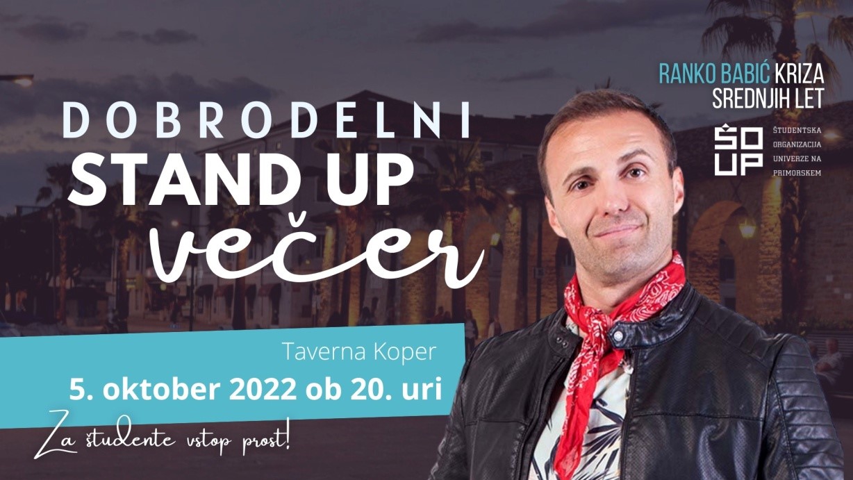 Tudi v letošnjem študijskem letu bomo poskrbeli za nasmejan prvi študijski teden. 5. oktobra 2022 bomo v Taverni pripravili Dobrodelni STAND UP z Rankom Babićem. Dogodek bo potekal od 20. ure, pred dogodkom pa bo potekalo druženje obiskovalcev ob dobri glasbi.