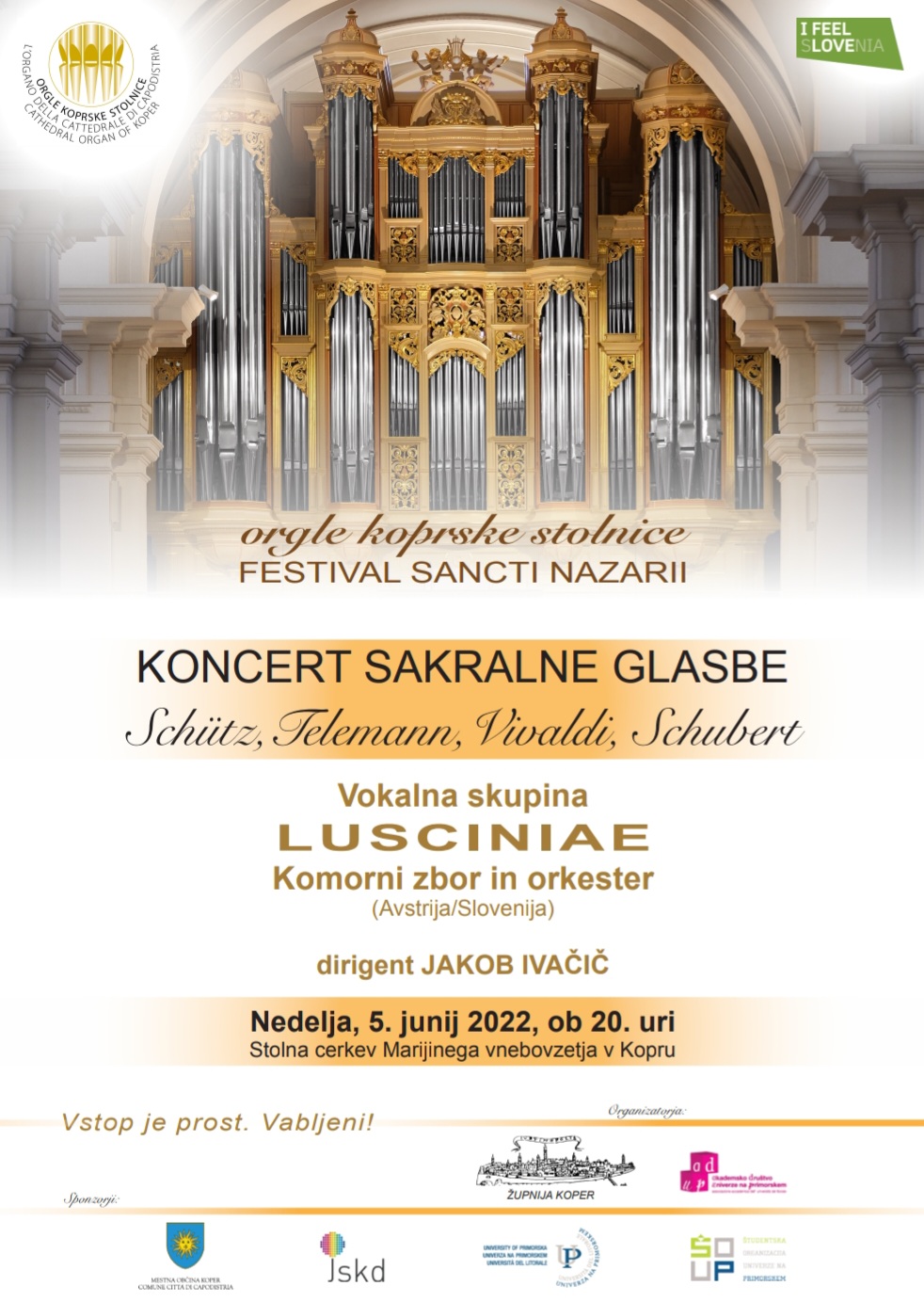 V Koper se po treh letih ponovno vrača Festival Sancti Nazarii, ki ga organizira APZ Univerze na Primorskem v sklopu mednarodnega cikla Simfonic voices. Prvi koncert sakralne glasbe bo v nedeljo, 5. junija 2022, ob 20. uri v koprski stolnici Marijinega vnebovzetja. Na njem se bo vokalna skupina Lusciniae (Avstrija / Slovenija) skupaj s projektnim zborom in orkestrom predstavila z deli Heinricha Schütza, Antonia Vivaldija, Georga Fridricha Telemanna in Franza Schuberta.