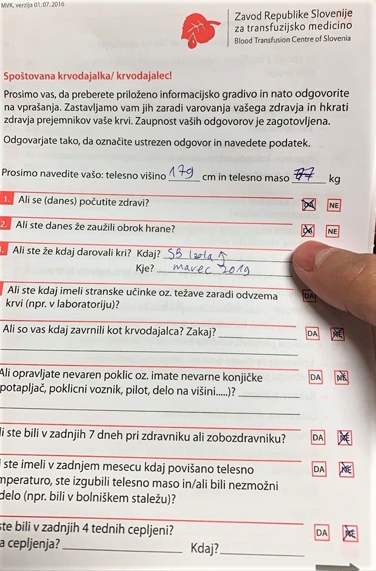 Na dan prihoda ob 10:35 me je diplomirana medicinska sestra, katera mi je naknadno odvzela kri, že čakala pri vratarju in me pospremila v pritličje, kjer je transfuzijain mi razložila potek. Še enkrat se je tudi pozanimala ali sem jedel zajtrk. Masko sem imel že na obrazu, razkužila mi je roke in pokazala mesto, kamor sem lahko odložil jakno. Še enkrat sem si razkužil roke in odšel v prvi prostor, kjer sem izpolnil vprašalnik, kjer je bilo jasno navedeno in si moral izpolniti vse podrobnosti, ki so potrjevale, da mi lahko odvzamejo kri. Podpisal sem tudi soglasje za odvzem krvi ter dobil potrdilo o darovanju. Sestre ter zdravnice so imele na sebi vso zaščitno opremo, za vsakim darovalcem so razkužile stol ter mizo, na kateri je sedel. Kuliji so bili oviti v plastično folijo. Vsak darovalec je dobil novega, da ne bi prišlo slučajno do stika. Nato sem odšel naprej do naslednje zdravnice. Malo sem moral počakati, saj je bila ena oseba pred mano. Po odhodu te osebe, je zdravnica razkužila mesto, kjer je sedela in me poklicala naprej (razdalje vsaj 1.5m med osebjem ter darovalci!).