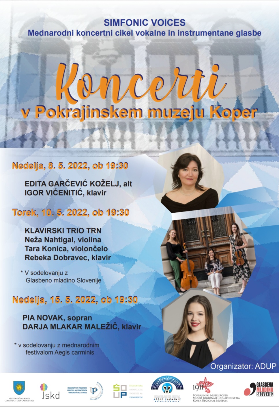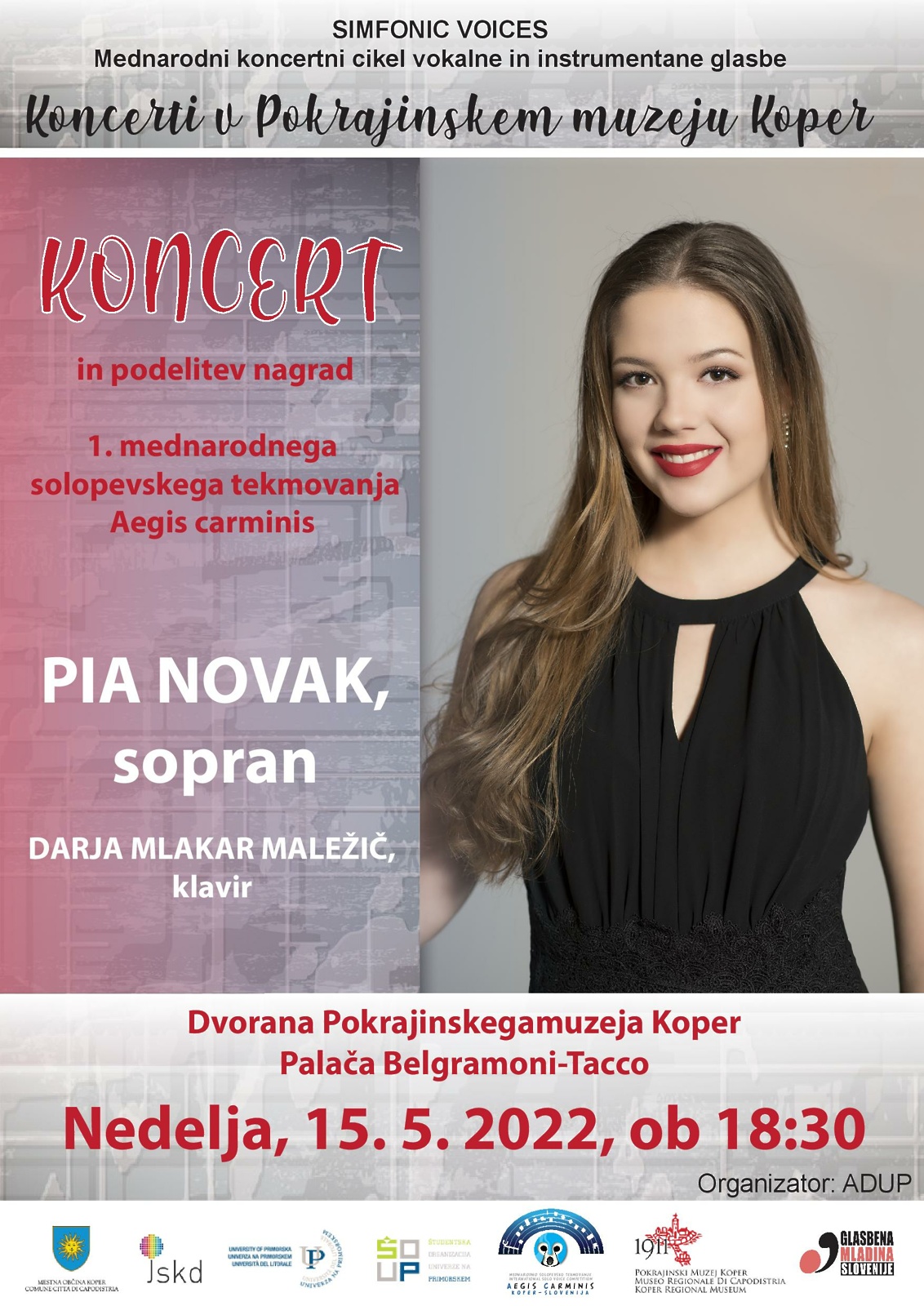 Zadnji, tretji koncert, pa zaključuje ponudbo 2. mednarodnega mladinskega zborovskega festivala Aegis carminis. Prvo nagrajenka, sopranistka Pia Novak se bo predstavila s programom arij in samospevov ob klavirski spremlavi Darje Mlakar Maležič v nedeljo, 15.5.2022, ob 18:30.