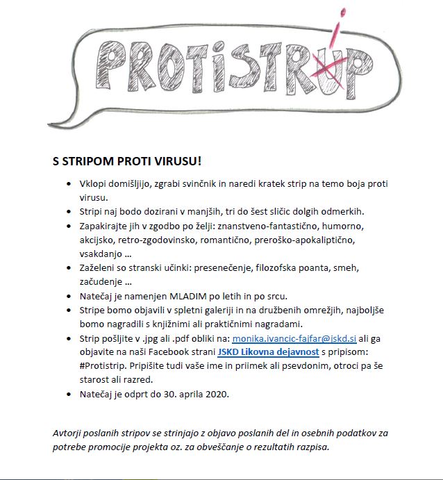 Vaša dela bomo objavili v spletni galeriji in na družbenih omrežjih, najboljše bomo nagradili s knjižnimi oz. praktičnimi nagradami. Natečaj je odprt do 30. aprila 2020.