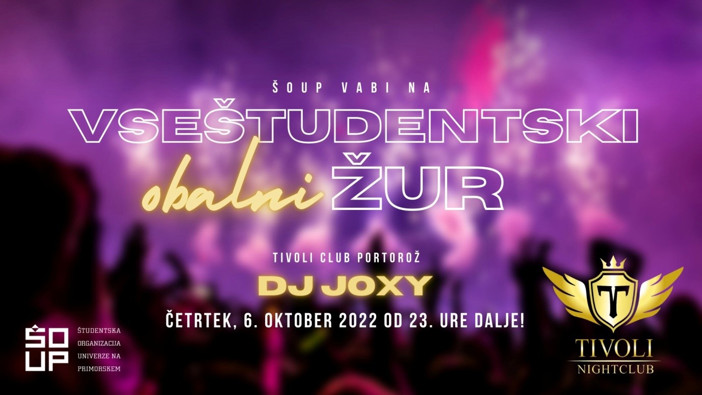 6. oktobra nas čaka VSEŠTUDENTSKI obalni žur v Tivoli clubu. Vsako leto se potrudimo, da organiziramo različne tematske zabave, letos pa smo se odločili, da v prvem študijskem tednu pripravimo nekaj tudi za tiste študente, ki študirajo v Portorožu. Obljubljamo nepozabno zabavo, študentske cene pijač ter dobro glasbo.