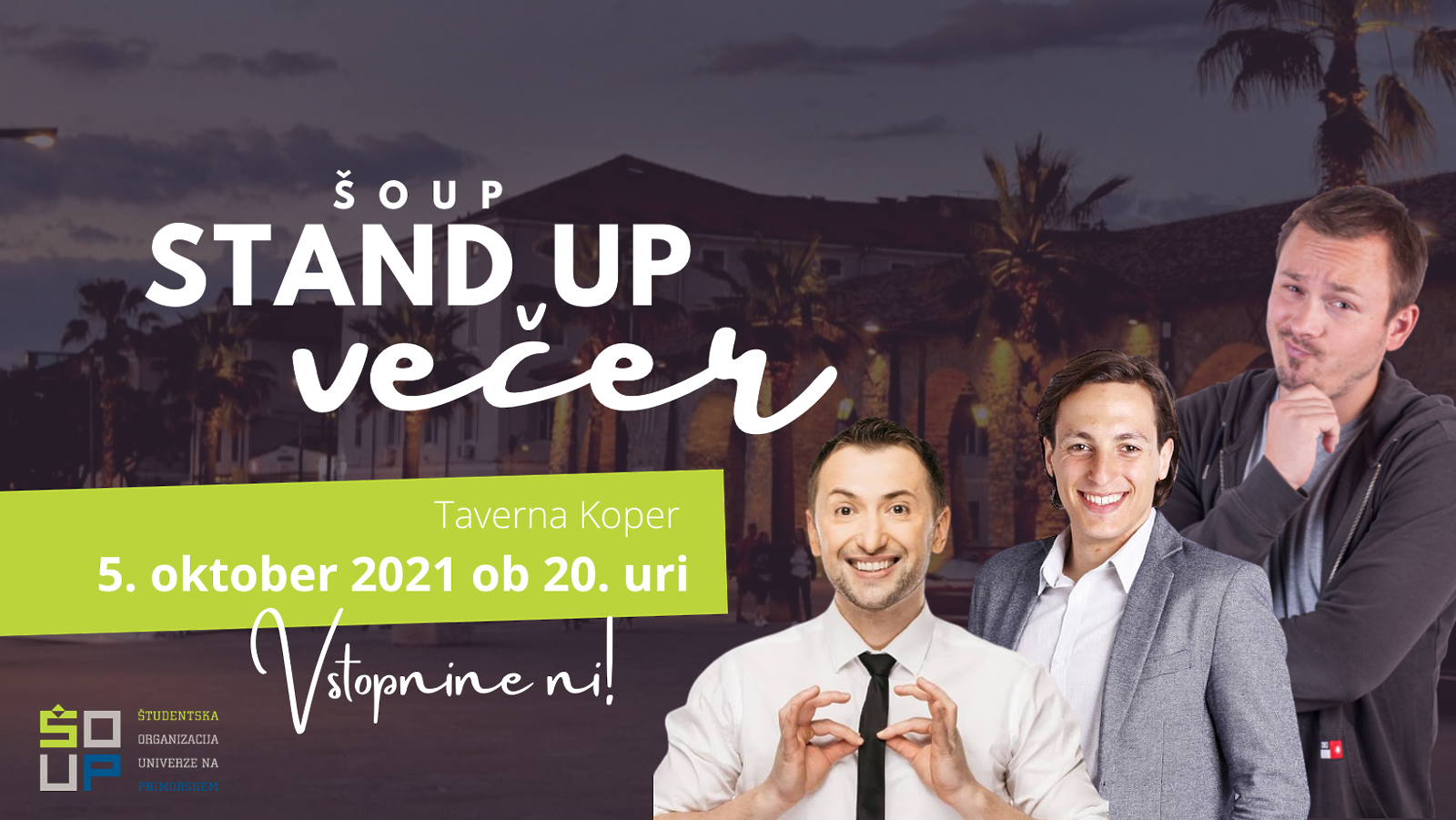 ŠOUP vabi študente UP in FPP na stand up večer s Perico Jerkovićem, Markom Žerjalom in Žanom Papičem. Vstopnine ni!